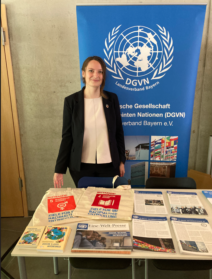 Der DGVN Landesverband Bayern unterstützte die Veranstaltung mit einem Impulsvortrag der Vorsitzenden des Landesverbands Carolin Maluck zum diesjährigen Jubiläum "80 Jahre UN" sowie zum aktuellen Stand der Agenda 2030 für nachhaltige Entwicklung. Daran schloss sich ein reger Austausch zu den Themen mit den Studierenden an.
